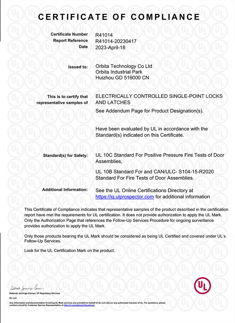 广东欧比特科技有限公司(ORBITA)作为酒店行业领先的酒店智能门锁和门禁系统研发生产企业,我们最新研发的酒店锁产品现已通过 UL-10C 测试, UL-10C是最严格和广泛认可的门用五金标准之一。