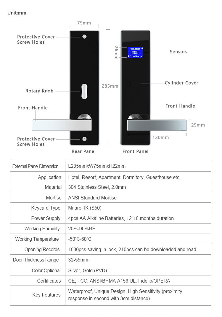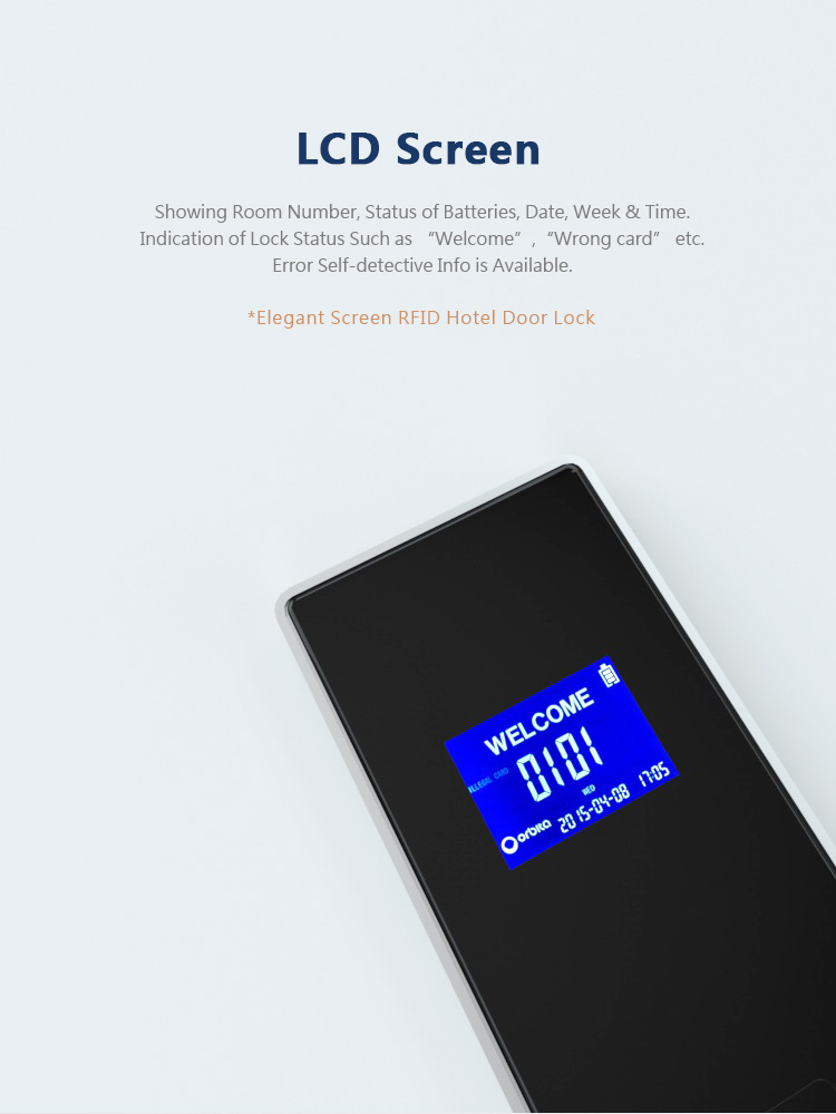1. LCD display show Welcome、Room Number 、Date、Time、Weekday 、Battery Status 、Wrong Operation Indication